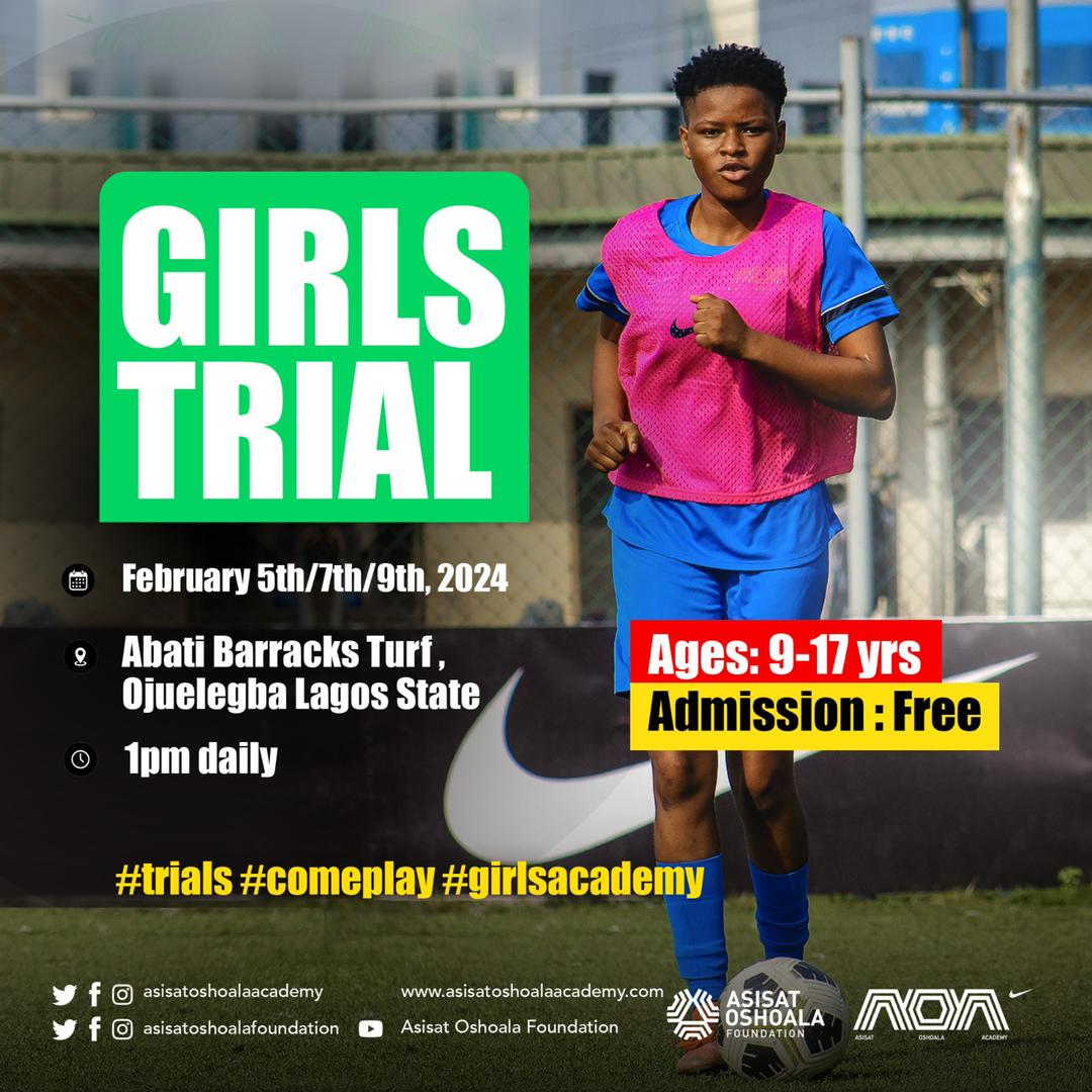Asisat Oshoala Academy (AOA), spearheaded by Asisat Oshoala MON, Africa’s reigning African Female Footballer of the Year and record-holder for the most CAF Player of the Year awards, is thrilled to unveil its upcoming scouting trials.