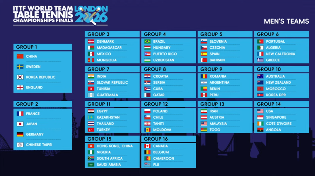 In the women’s competition, hosts England were drawn in Group 2 with Japan, Germany, and France, while China, 23-time Corbillon Cup winners, lead Group 1 against Korea Republic, Chinese Taipei, and Romania.