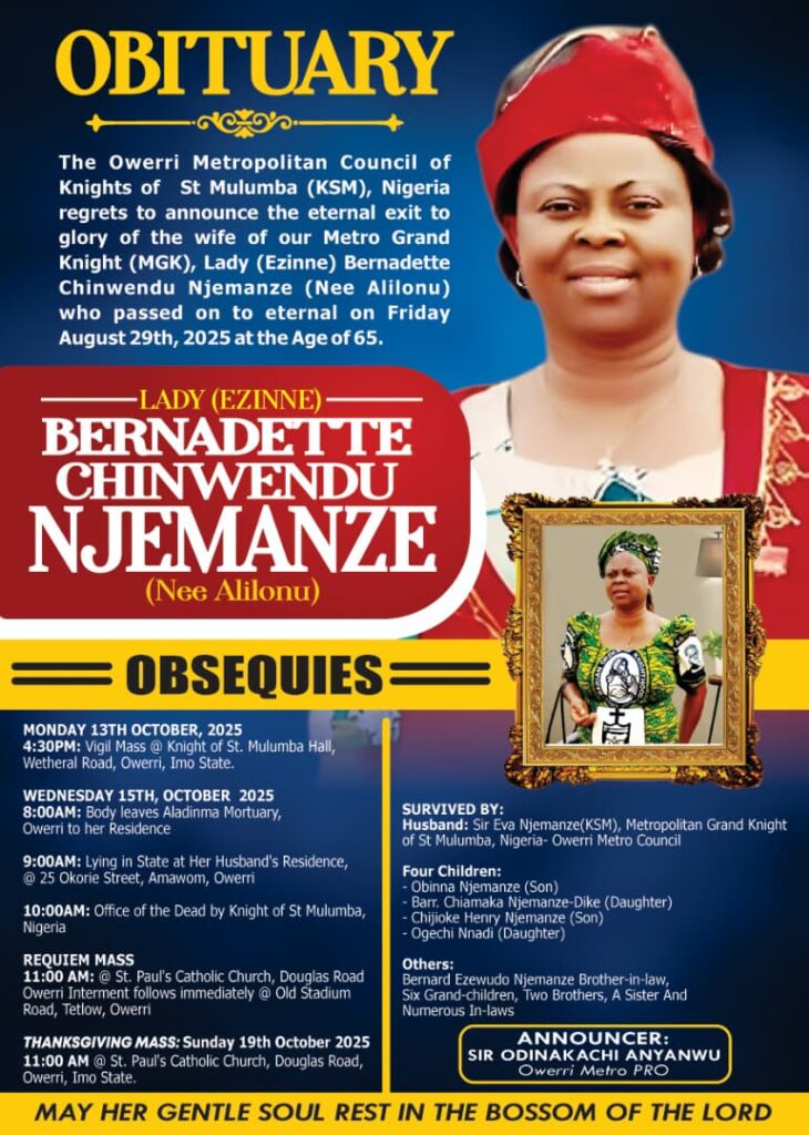 The Public Relations Officer of the Owerri Metropolitan Council of the Knights of St. Mulumba Nigeria (KSM), Sir Odinakachi Anyanwu, has announced that arrangements have been finalized for the burial of Lady (Ezinne) Bernadette Chinwendu Njemanze, beloved wife of the Owerri Metro Grand Knight, Sir Eva Njemanze, who was called to eternal rest on Friday, August 29, 2025.