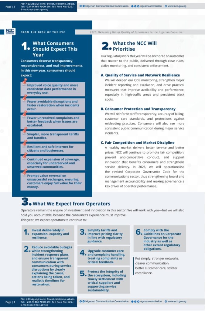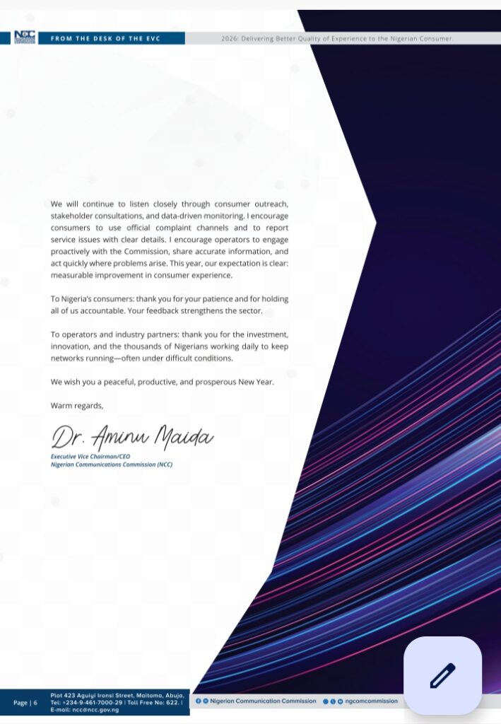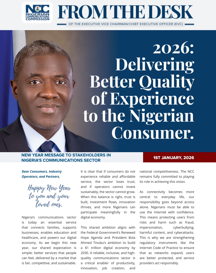 “As we begin 2026, Nigeria’s communications sector remains central to how we live, work, learn, and do business. Our shared expectation for the year ahead is simple but critical: better quality of experience for consumers, delivered through a fair, competitive, and sustainable market. When services are reliable and affordable, trust is built; when investment is stable, networks expand, innovation thrives, and more Nigerians can participate meaningfully in the digital economy. This vision aligns with President Bola Ahmed Tinubu’s Renewed Hope Agenda and the ambition to build a $1 trillion digital economy by 2030,” Maida said.