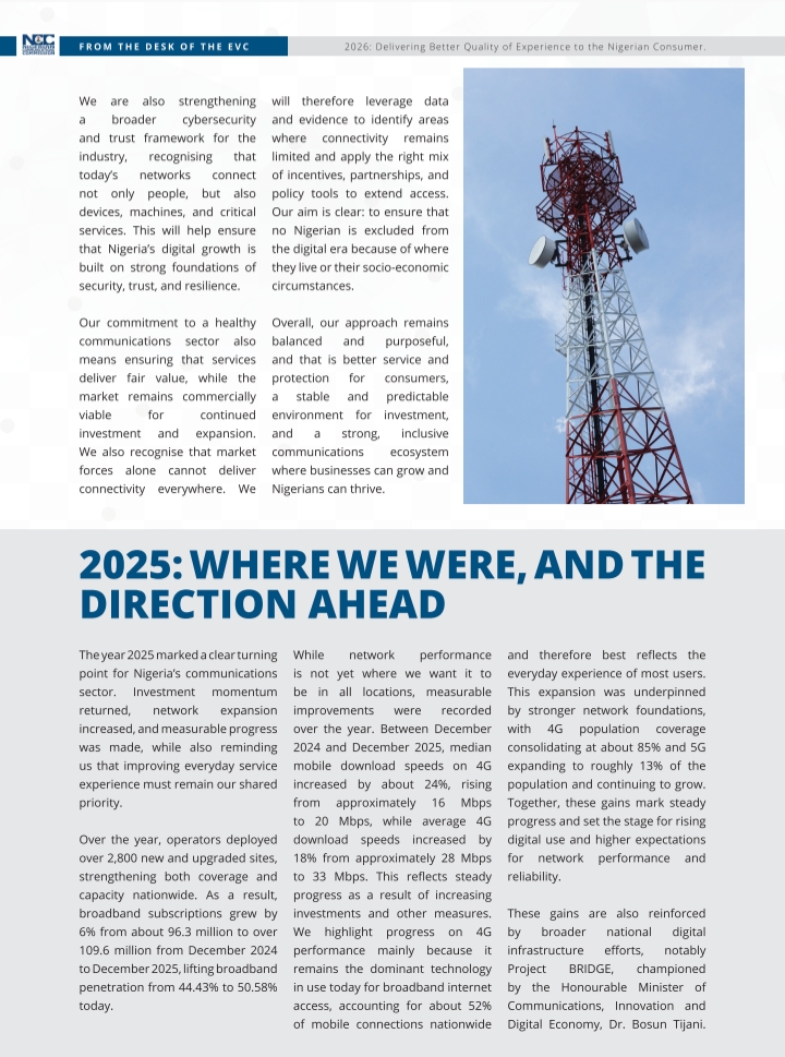 “The year 2025 marked a turning point. Investment momentum returned, network expansion accelerated, and measurable improvements were recorded across coverage, capacity, and performance. Broadband subscriptions grew to over 109 million, median download speeds improved significantly, and 4G and 5G coverage continued to expand nationwide. Major initiatives such as Project BRIDGE are strengthening Nigeria’s digital backbone, while closer collaboration with institutions like the Central Bank of Nigeria is already delivering tangible consumer benefits, including refunds for unsuccessful airtime and data transactions.