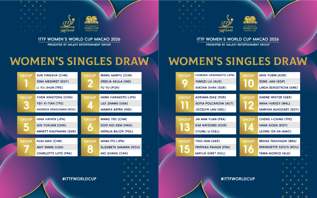 The draw has thrown up several compelling encounters to watch across the week. In the men’s competition, reigning champion Calderano faces Kristian Karlsson in Group 3, two players who know each other’s game well having met five times before. Dimitrij Ovtcharov and Liang Jingkun, who served up a five-game thriller at Singapore Smash earlier this year, meet again in Group 9, while Darko Jorgic and An Jaehyun renew a rivalry that produced one of the tightest matches of last year’s tournament in Group 13. In the women’s draw, Bruna Takahashi faces Bernadette Szocs in Group 16 having beaten her 4-0 here last year, and Elizabeta Samara, who came from two games down to beat Mima Ito at WTT Champions Montpellier last year, will be looking to repeat the feat when the two meet in Group 8.