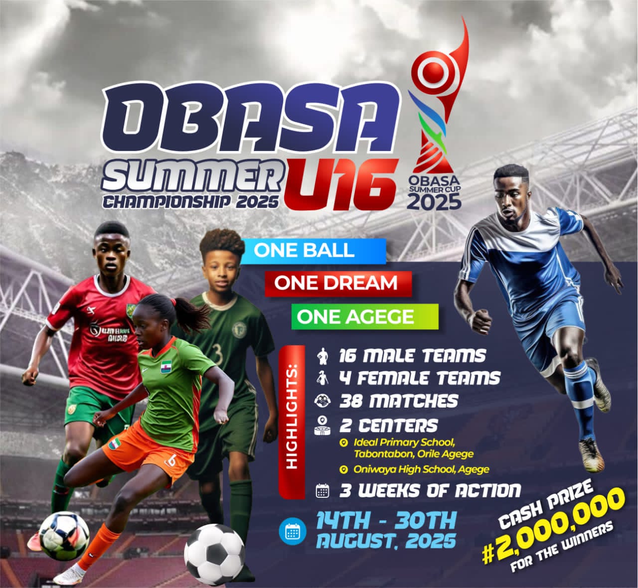 A total of 16 male teams under the age of 16—eight each from Agege and Orile Agege—and four female teams (free age) will battle for glory across two key venues: Idea Primary School, Tabontabon, Orile Agege and Oniwaya High School, Agege.