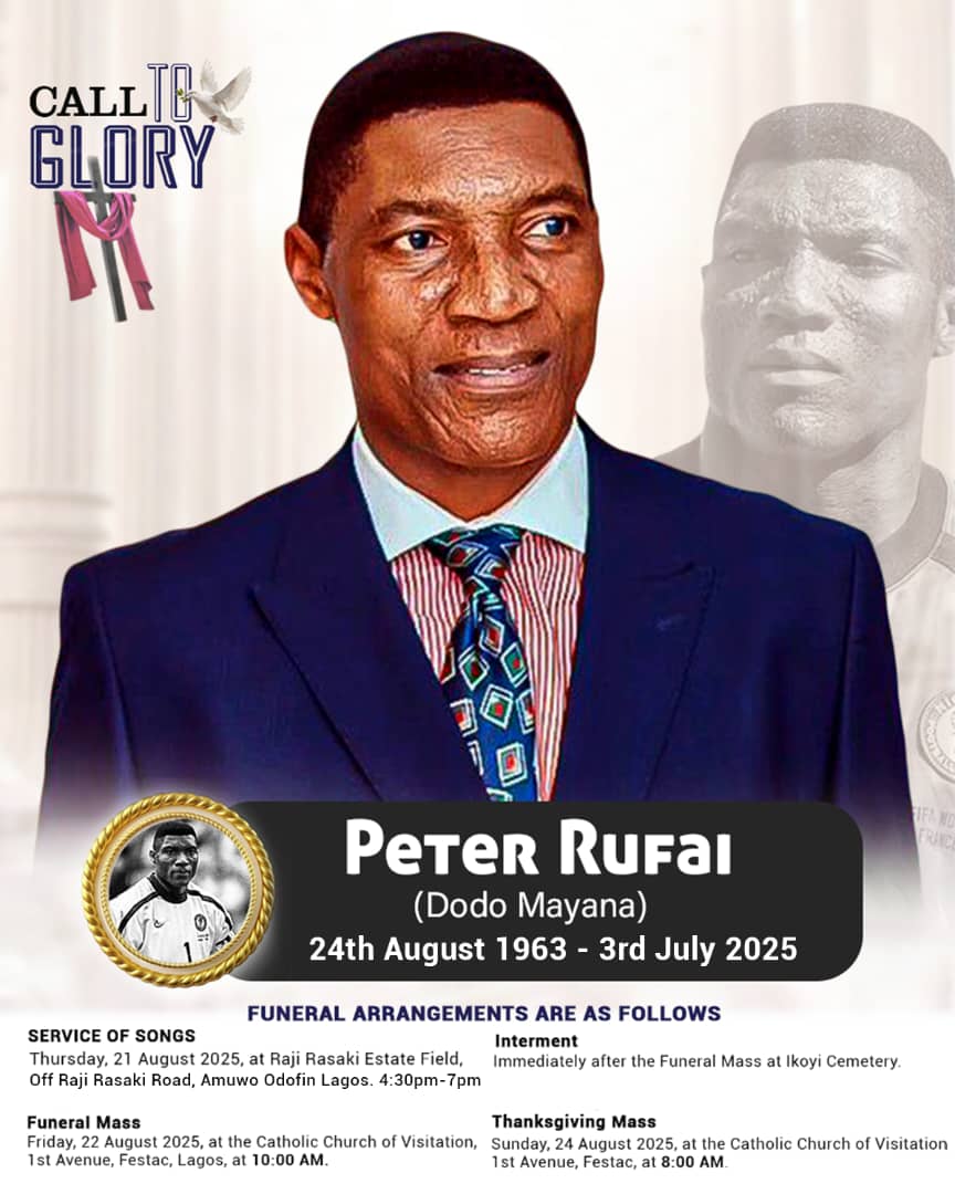 Professional Footballers Association of Nigeria (Nigeria), have concluded arrangements to ensure the late legendary Nigeria goalkeeper Peter Rufai gets a befitting final journey which begins 21st August, 2025.