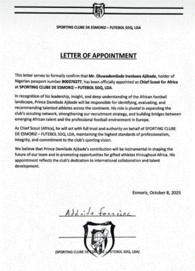 FC Esmoriz of Portugal has made history by appointing a 20-year-old Nigerian as the club’s chief scout in Africa.